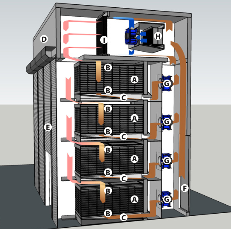 The ventilator (G) sucks the process air (U) through the Canna-Trays (A), filters (B) and venitlation pallet (C)