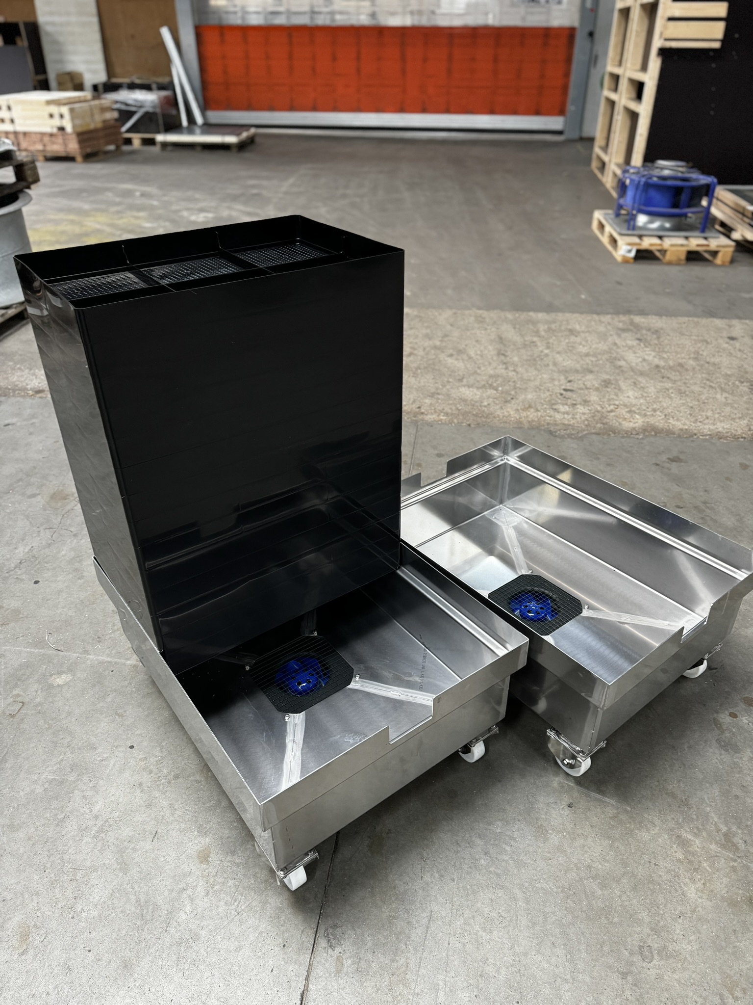 A HEPA filter is put on the table, followed by two stacks of Canna-trays, and topped by another HEPA filter, creating a Sandwich unit