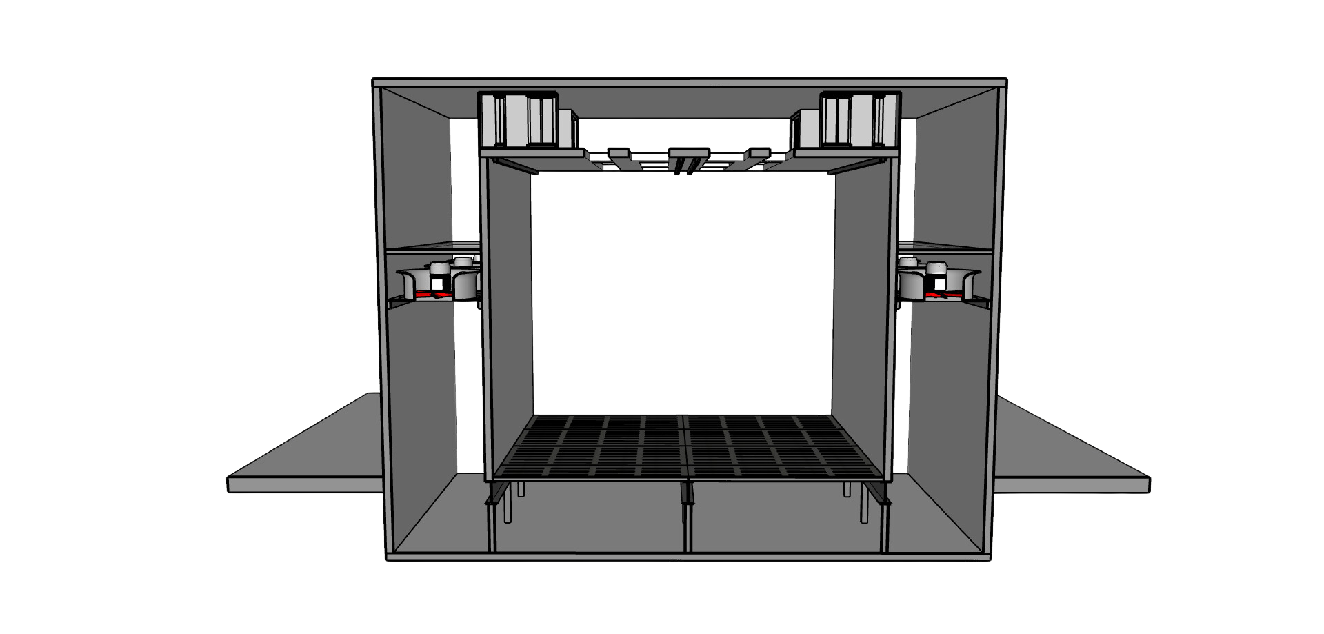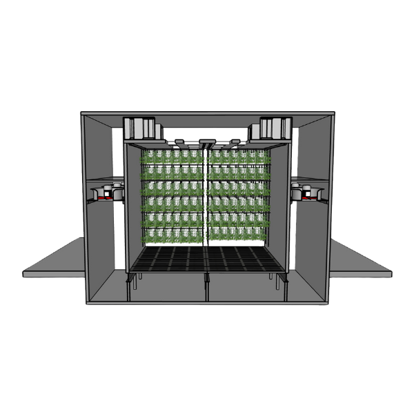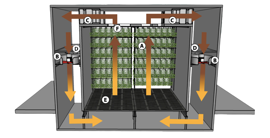 To have a optimal aeration through the plants, we use a Bottom-up airflow. The plant is conic, and this airflow forces the air to really go through the plants, instead of bend of and go besides the plants. Whereas a laminal airflow will seek the path of least resistance, and will result in wet spots.